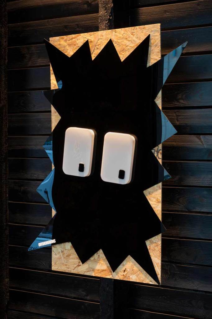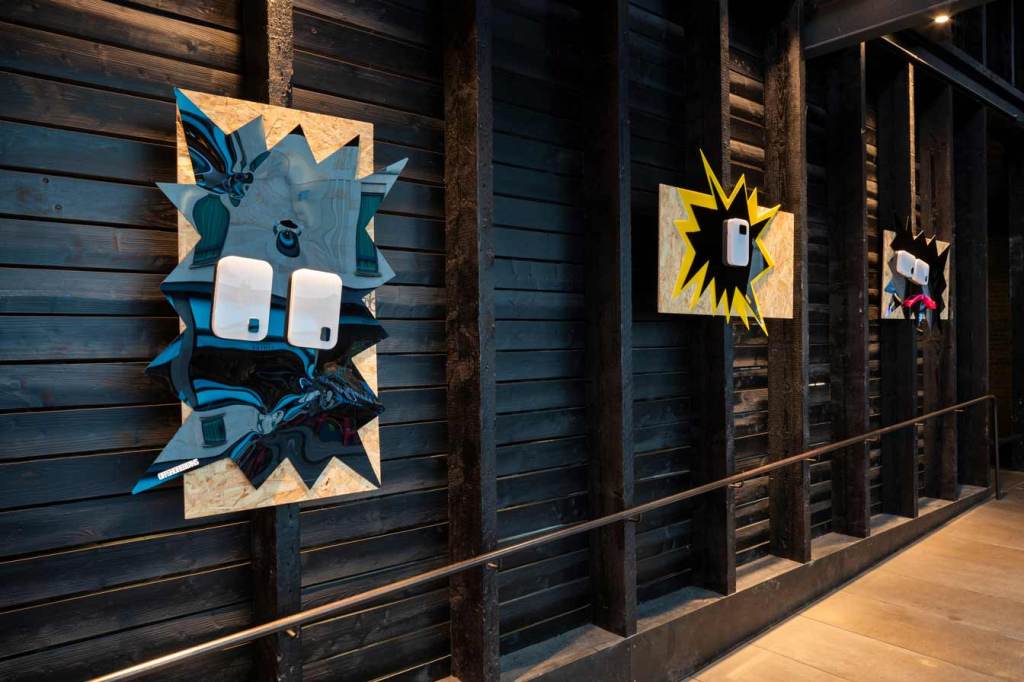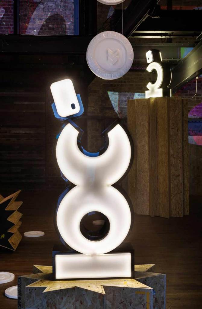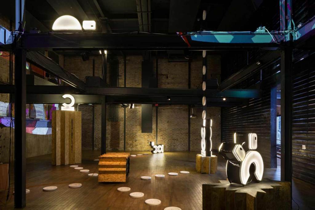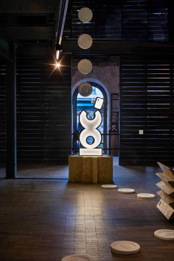 The dystopian collapse of the welfare system, alongside allusions to futures deferred or foreclosed as consumers are drawn ever deeper into cycles of debt, is further underscored by the inclusion of a soundtrack that I produced for the exhibition. This dystopian, deconstructed echo of a club culture long since past was included by Jamie as a contrasting counterpoint to the playful illuminated characters. This audio layer adds an additional a/tonal register to what Cooper describes as the way ‘generations of meaning have been distilled, unconsciously, into these signs like the Nike swoosh and the Coco Chanel logo’ reminding viewers of the insidious and never-ending long-armed reach of the corporate world.