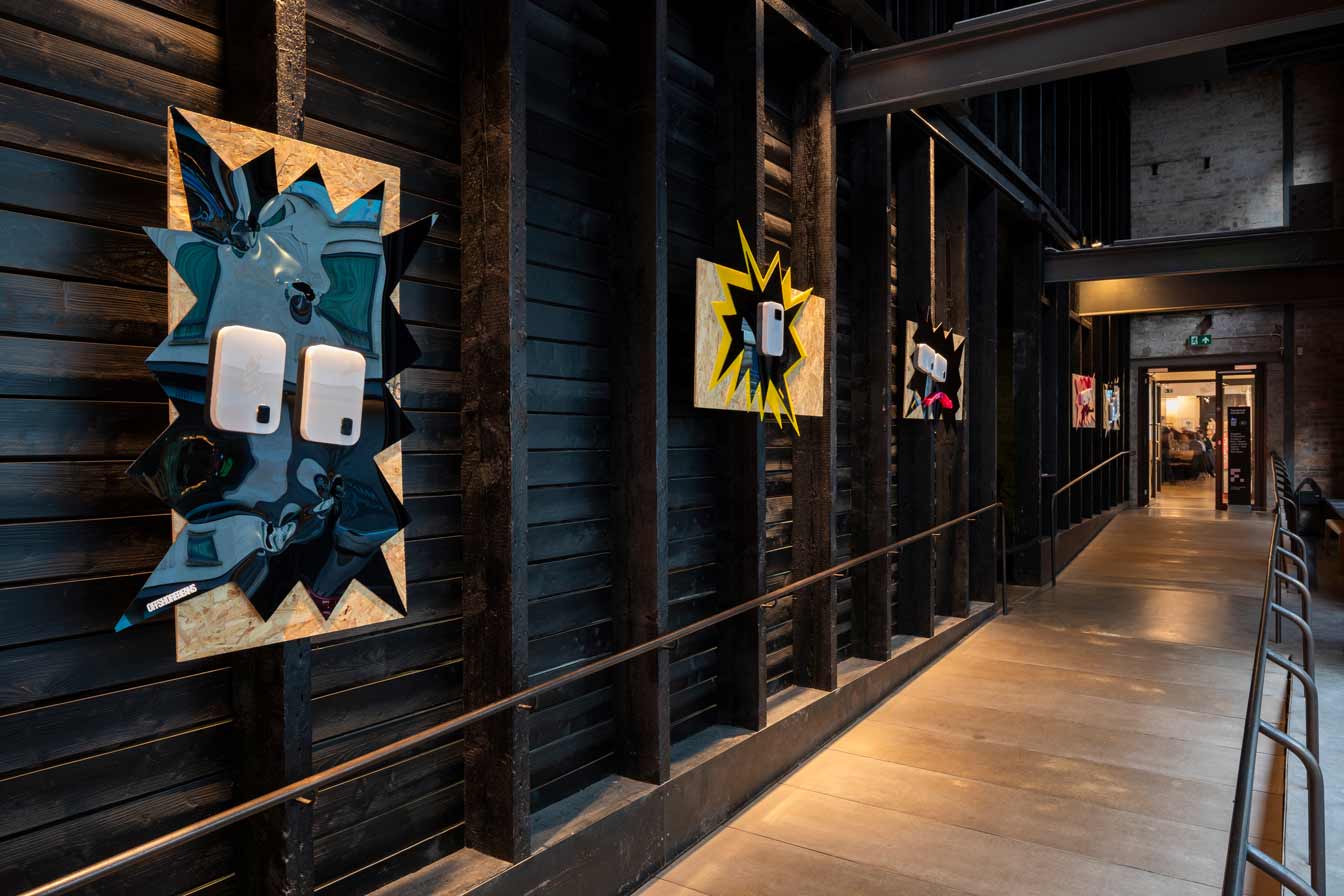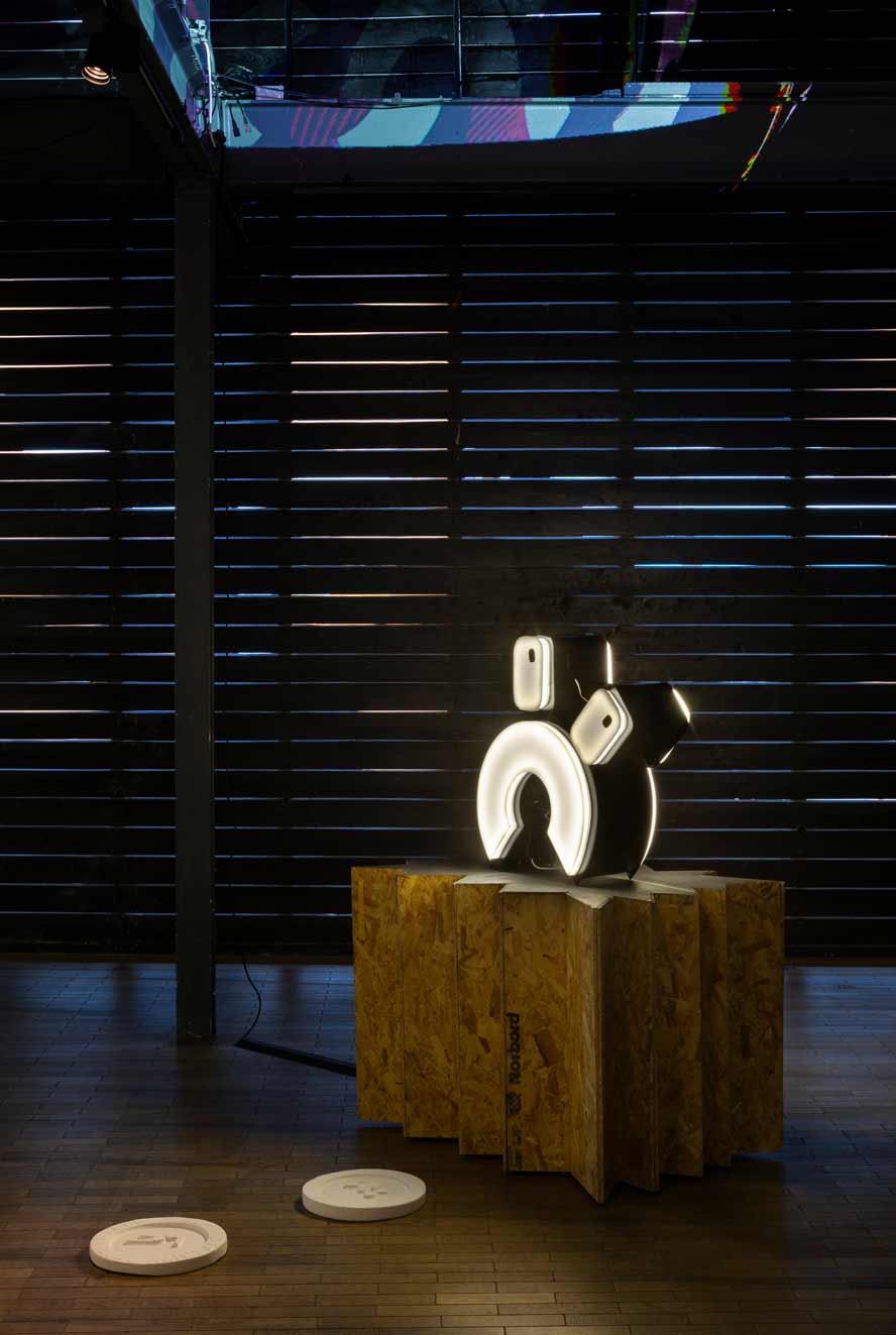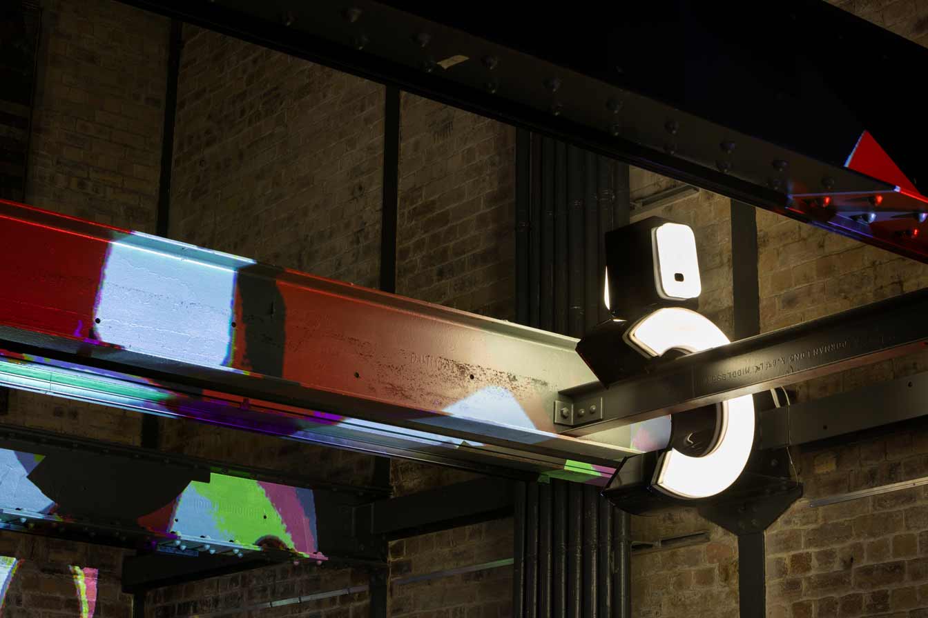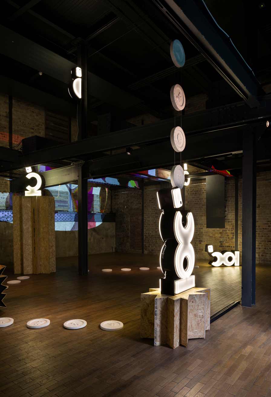 The dystopian collapse of the welfare system, alongside allusions to futures deferred or foreclosed as consumers are drawn ever deeper into cycles of debt, is further underscored by the inclusion of a soundtrack that I produced for the exhibition. This dystopian, deconstructed echo of a club culture long since past was included by Jamie as a contrasting counterpoint to the playful illuminated characters. This audio layer adds an additional a/tonal register to what Cooper describes as the way ‘generations of meaning have been distilled, unconsciously, into these signs like the Nike swoosh and the Coco Chanel logo’ reminding viewers of the insidious and never-ending long-armed reach of the corporate world.